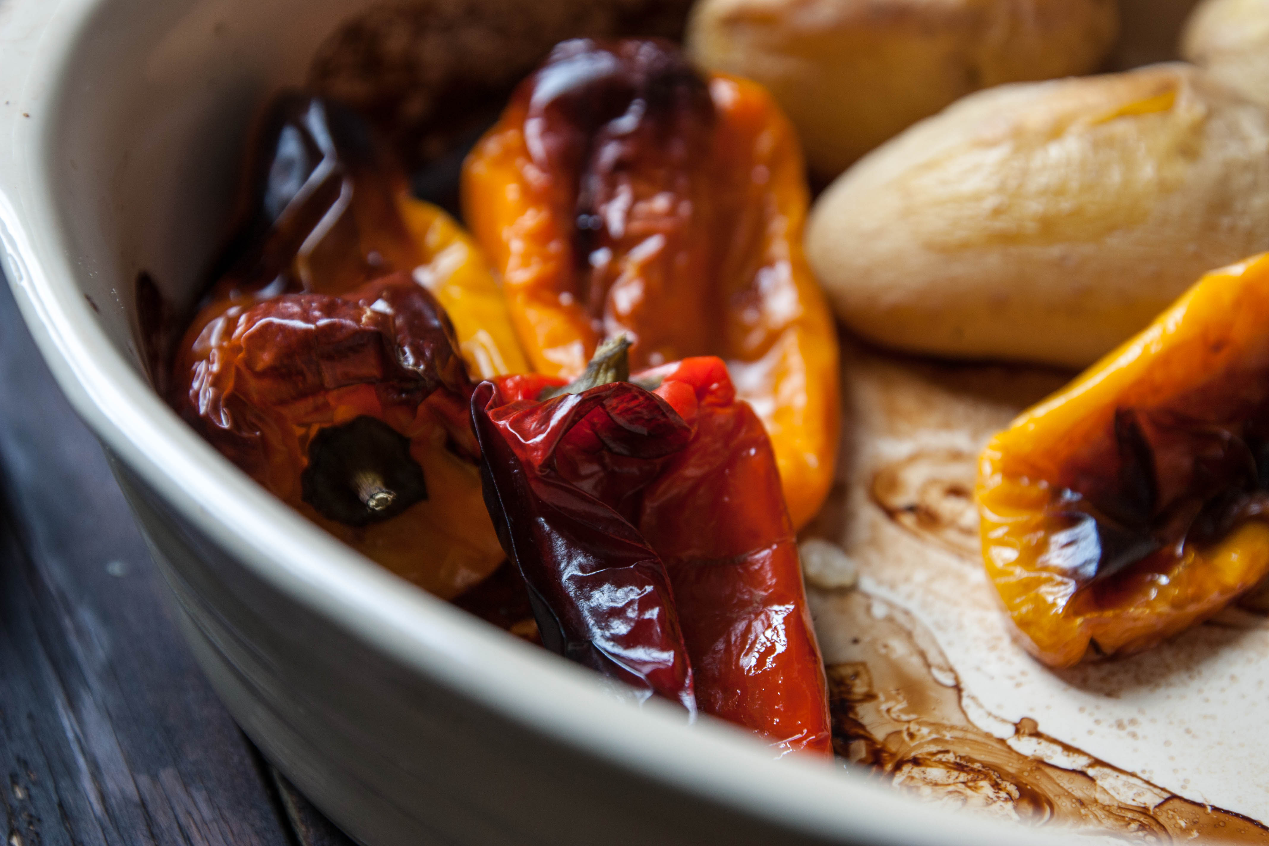 Warzywa najpierw pieczemy w piekarniku, około godziny, aż będą miękkie. Pomidory i paprykę włożyć do piekarnika na końcu , na pół godziny. Warzywa lekko przestudzić, obrać ze skórek, pokroić w kostkę. Wszystko wrzucić do garnka, zalać wodą jeszcze raz tyle ile warzyw, dodać czubatą łyżeczkę warzywnego bulionu, świeżo mielony pieprz i pogotować około 15 min. Zupę zmiksować i doprawić według upodobań: solą, pieprzem, sosem sojowym, śmietaną, ziołami np zieloną pietruszką, świeżą bazylią, majerankiem. Jeśli zupa po zmiksowaniu jest za gęsta dodać gorącej wody i wymieszać. Oczywiście bez miksowania też jest pyszna.