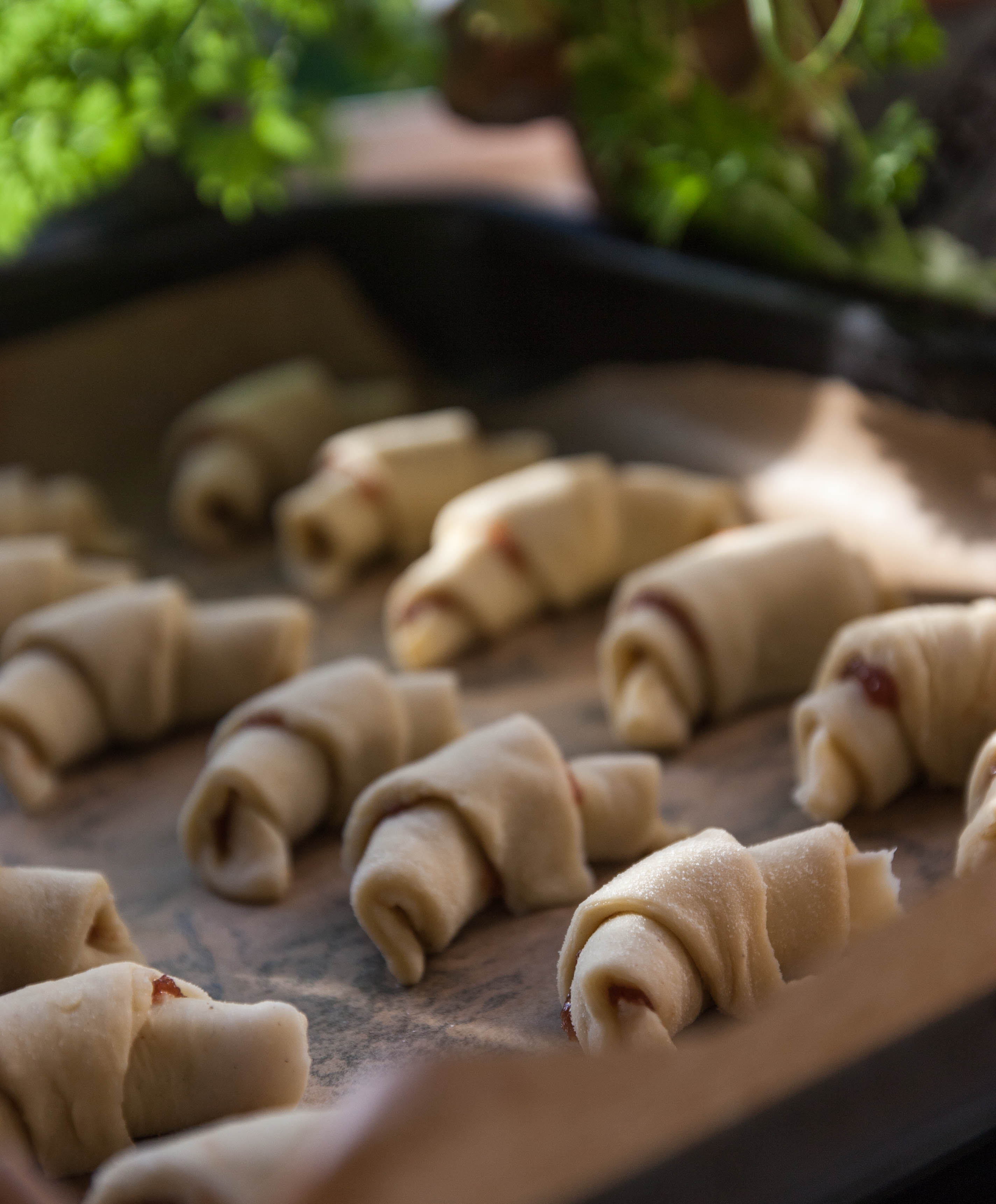 Powstałe prostokąty podzielić nożem na trójkąty. Trojkąty posmarować marmoladą i zwijać w rogaliki. Układać na blaszce wyłożonej papierem do pieczenia. Piekarnik nagrzać do 210 st i piec okolo 13 do15 min do zezłocenia. Pozostawić do przestygnięcia na blaszce.