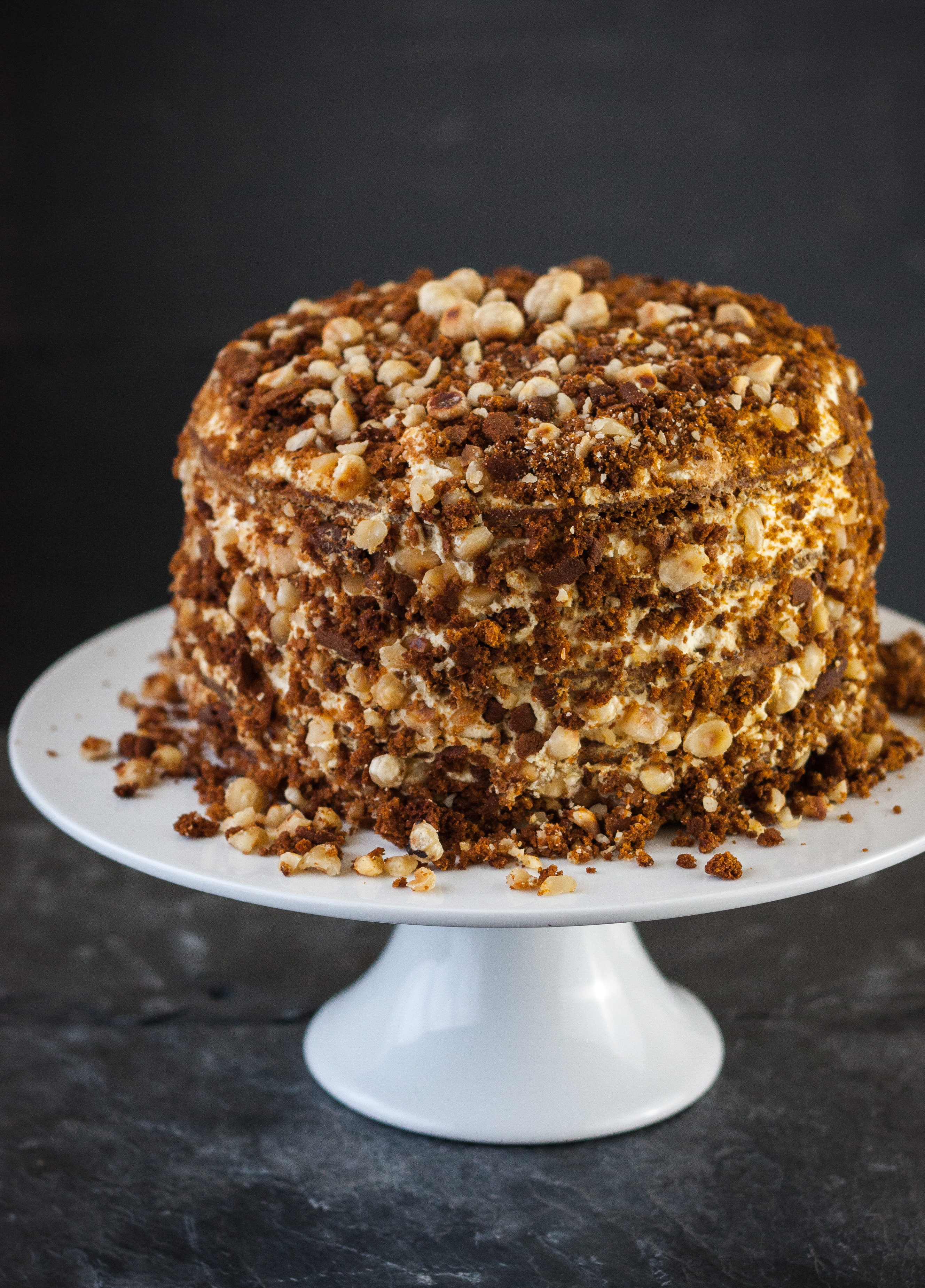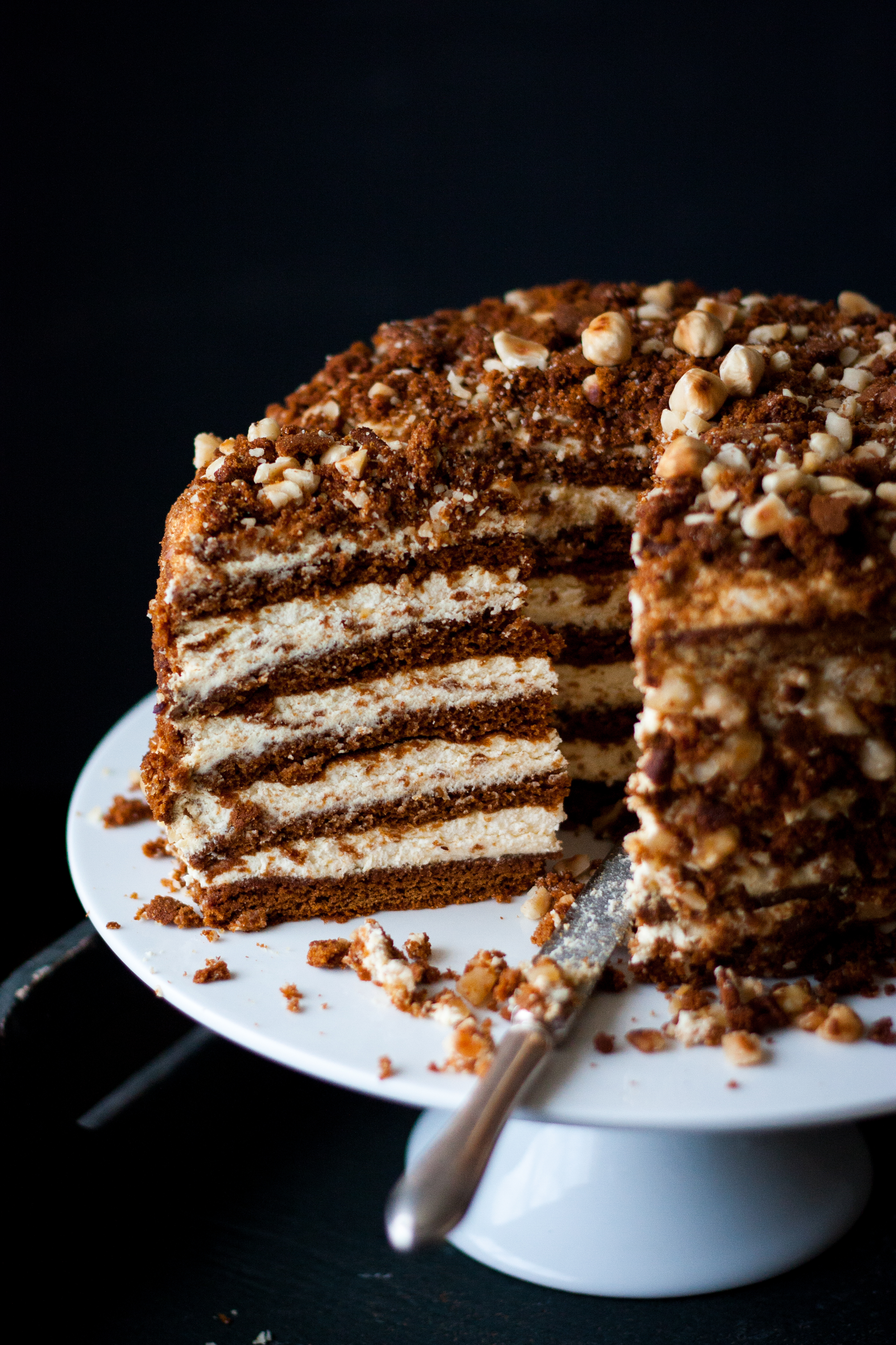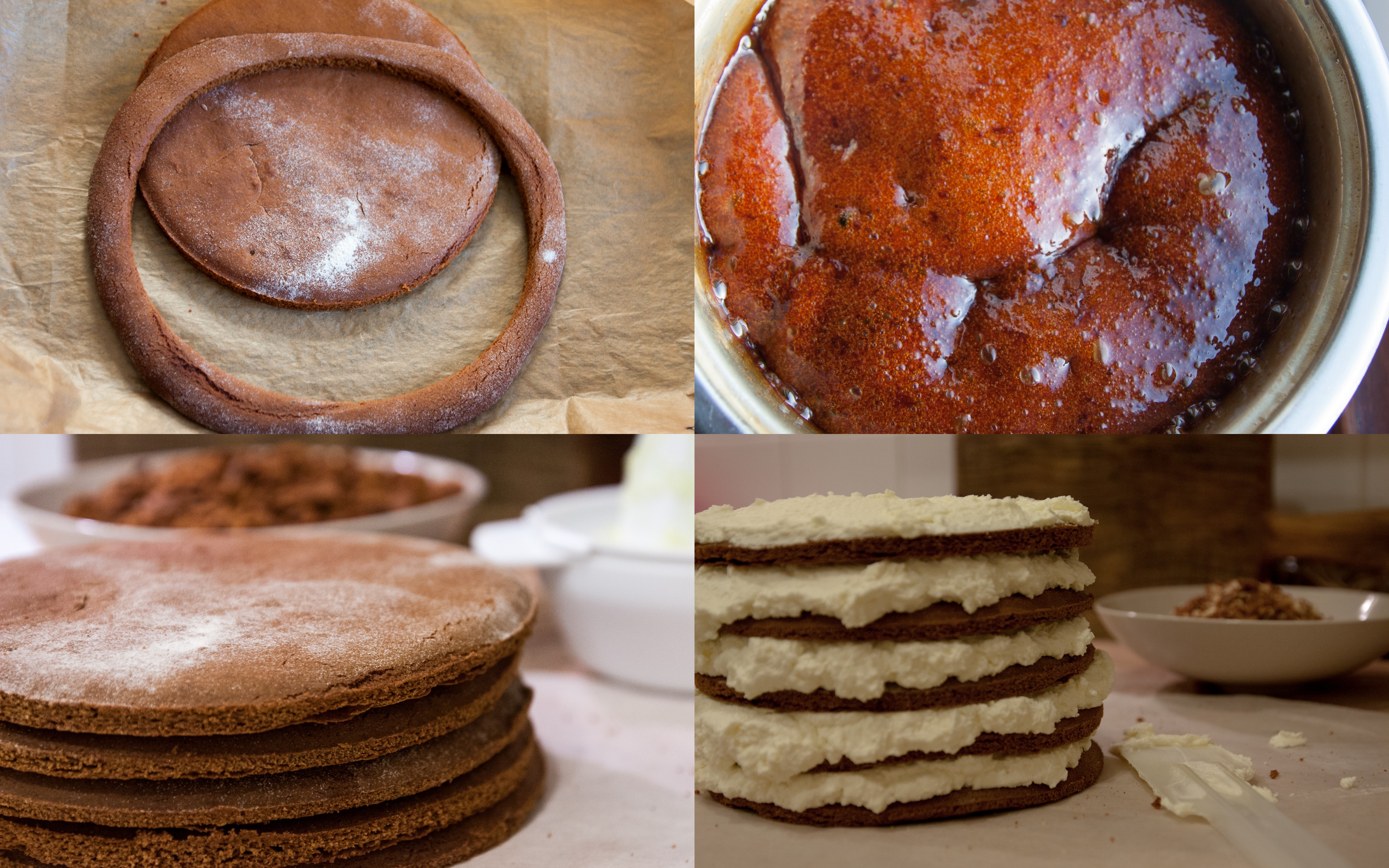 Piekę go najczęściej na święta. Jest tortem, ale nie wymaga specjalnych zdolności przy pieczeniu i dekorowaniu. Upieczone płaty smaruje się ubitą śmietaną wymieszaną z sokiem z cytryny, a boki posypuje się okruszkami zmieszanymi z prażonymi orzechami. Całość zawijam w papier na noc, żeby twarde płaty ciasta zmiękły od śmietany. Ciasto jest gotowe po 12 godzinach.