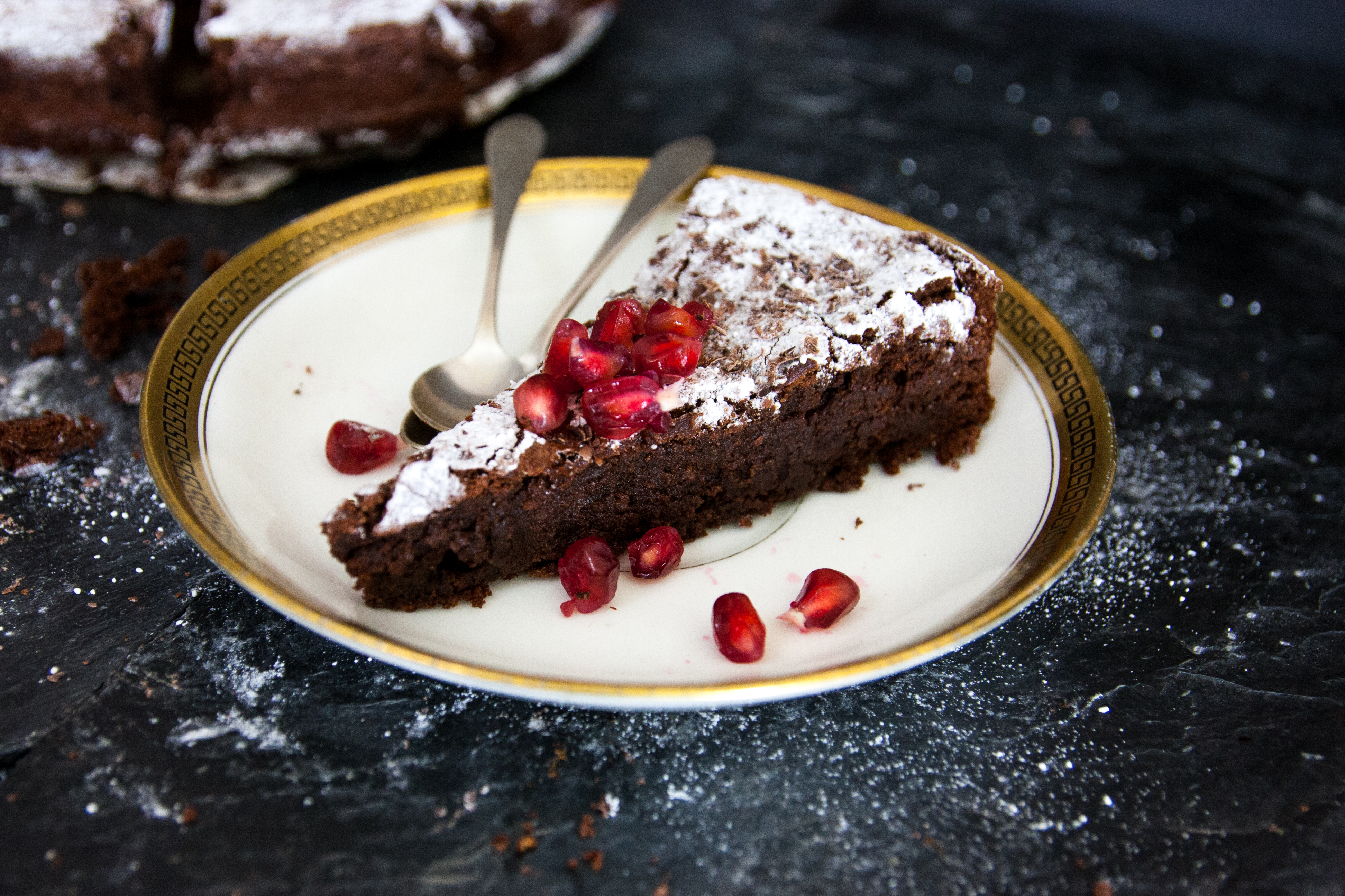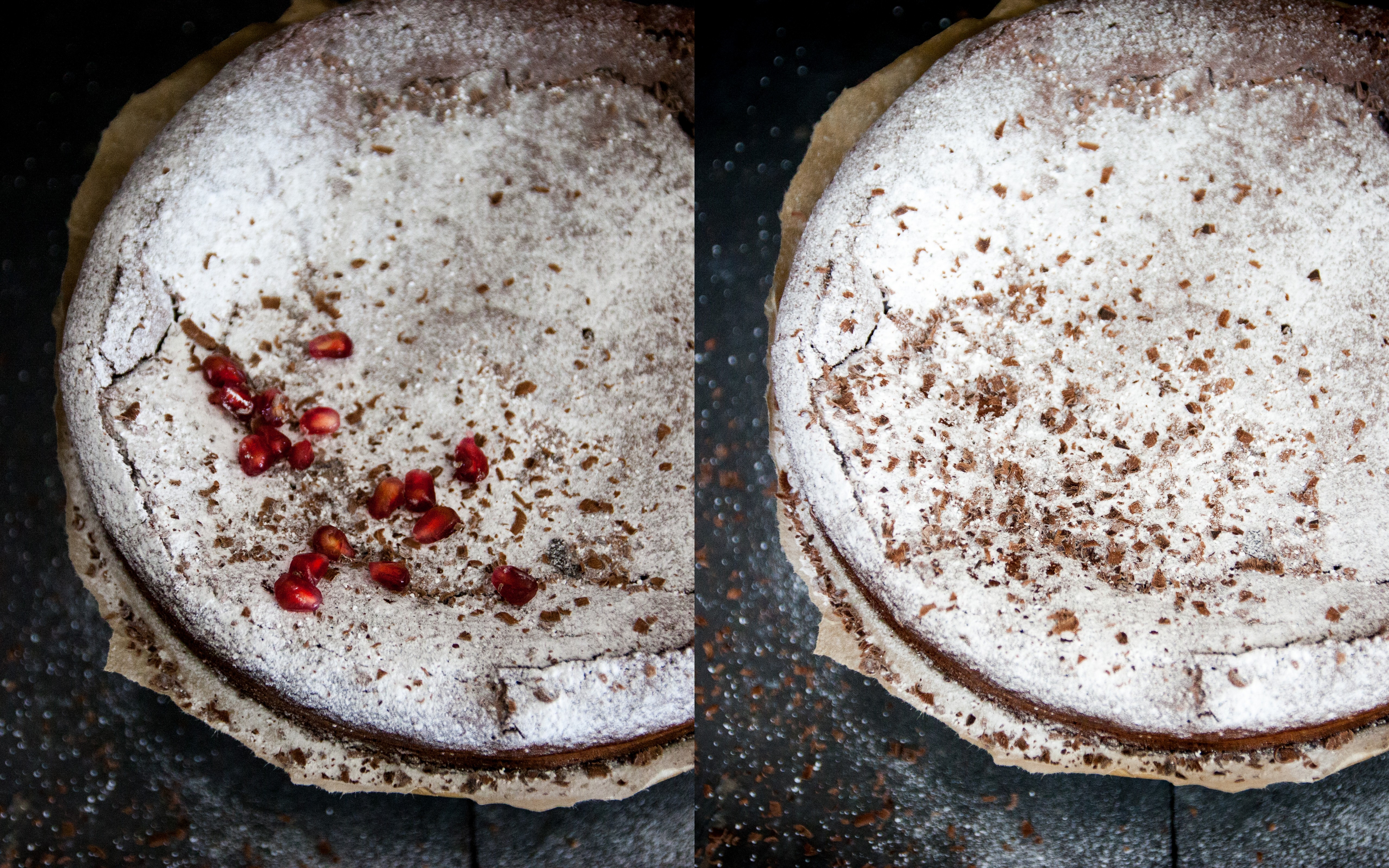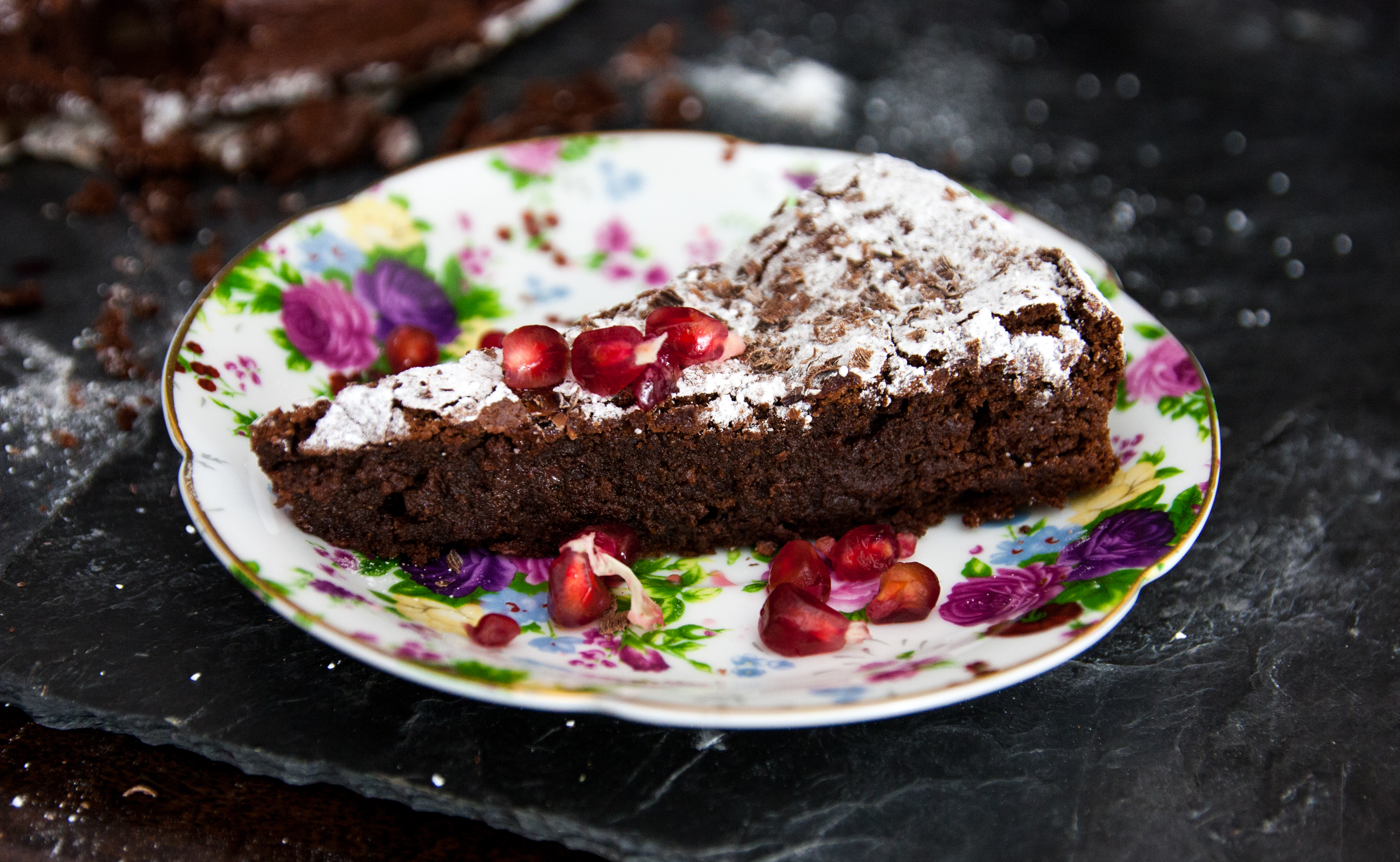 Po ostygnięciu ciasto delikatnie opada. W środku jest mokre, miękkie i pięknie czekoladowe. Posypać tylko cukrem pudrem. Często dodaję drobne owoce sezonowe, tym razem granat.