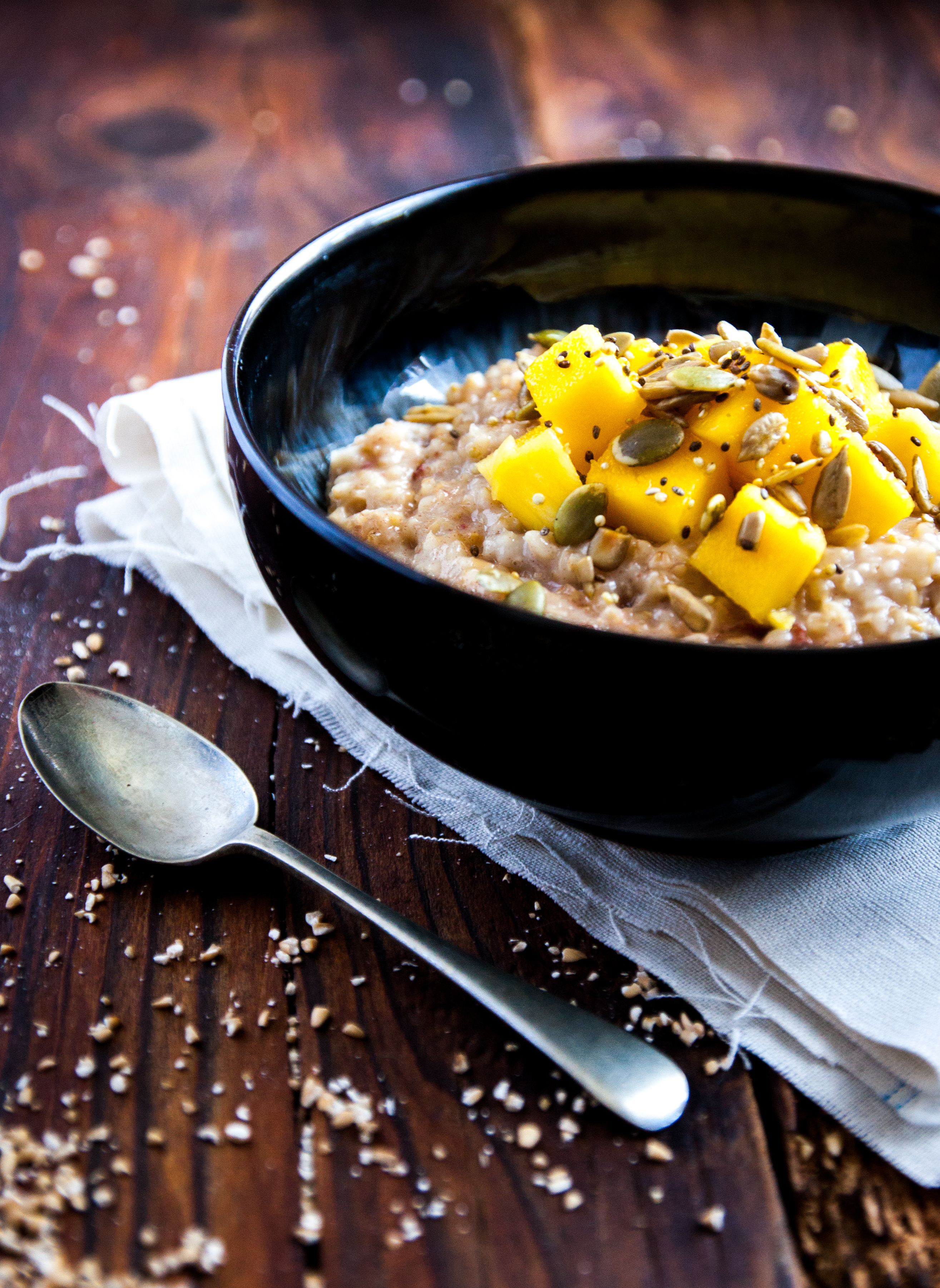 Ziarna owsa lub płatki dodać do niedużego rondelka, zalać wodą, dodać daktyle i doprowadzić do wrzenia. Gotować 2-3 min, nastepnie dodać mleko i sól. Cukier nie jest potrzebny, ponieważ daktyle sa wystarczająco słodkie. Znów doprowadzić do wrzenia, wyłaczyć gaz i zostawić pod przykryciem na 20 min. I gotowe! Dodać świeże owoce i posypać ziarenkami ( u mnie mango, dynia, słonecznik).