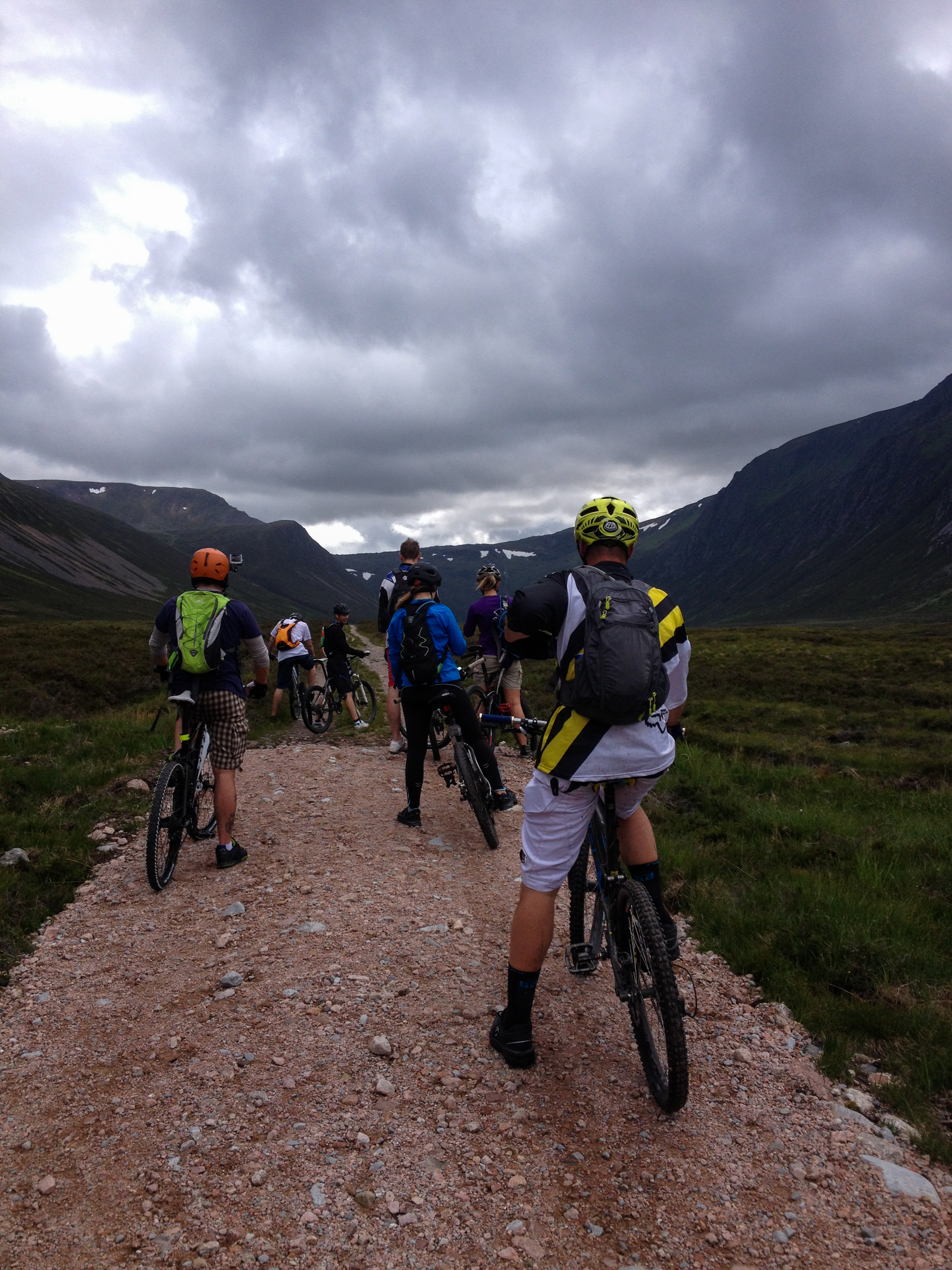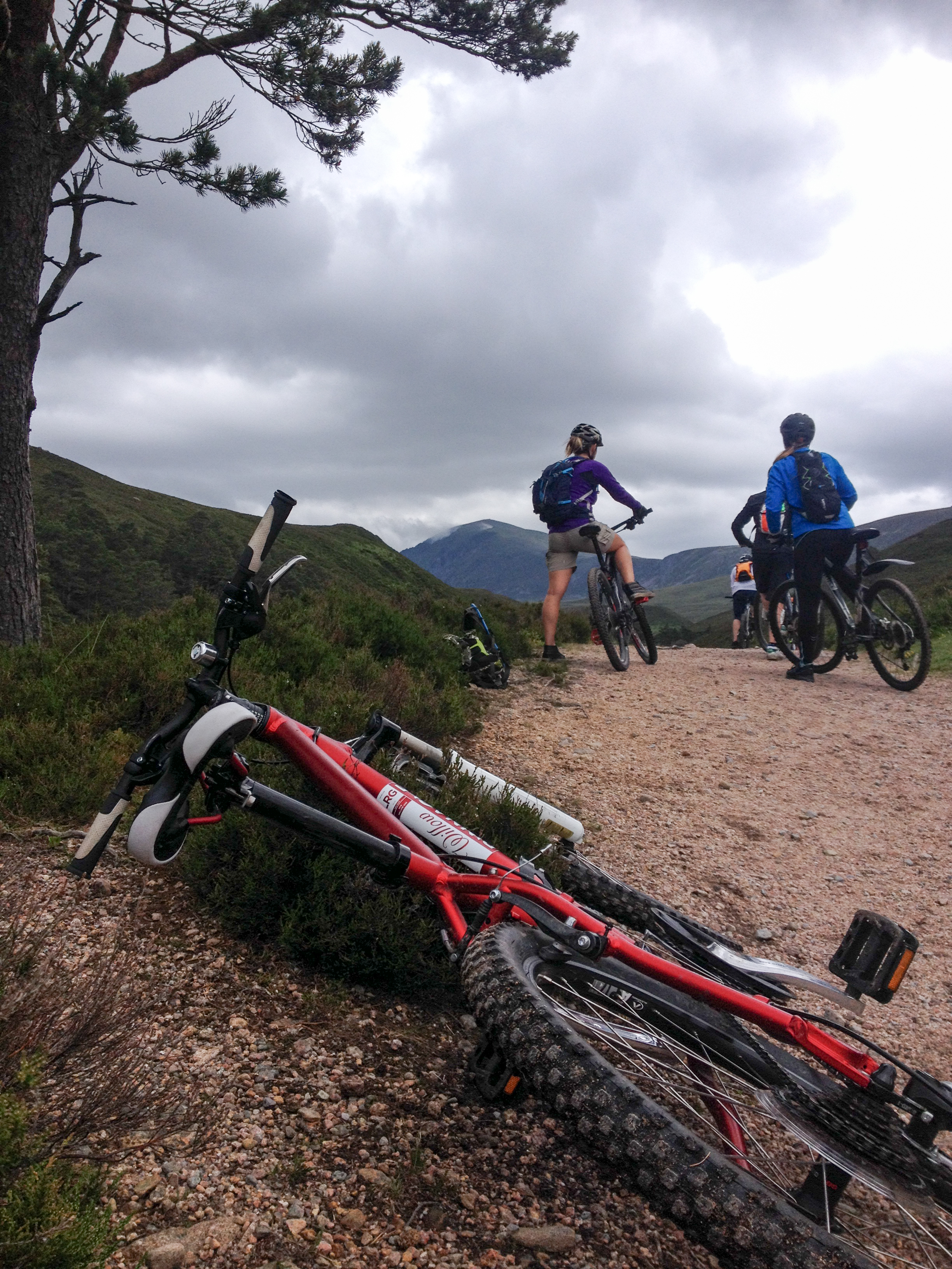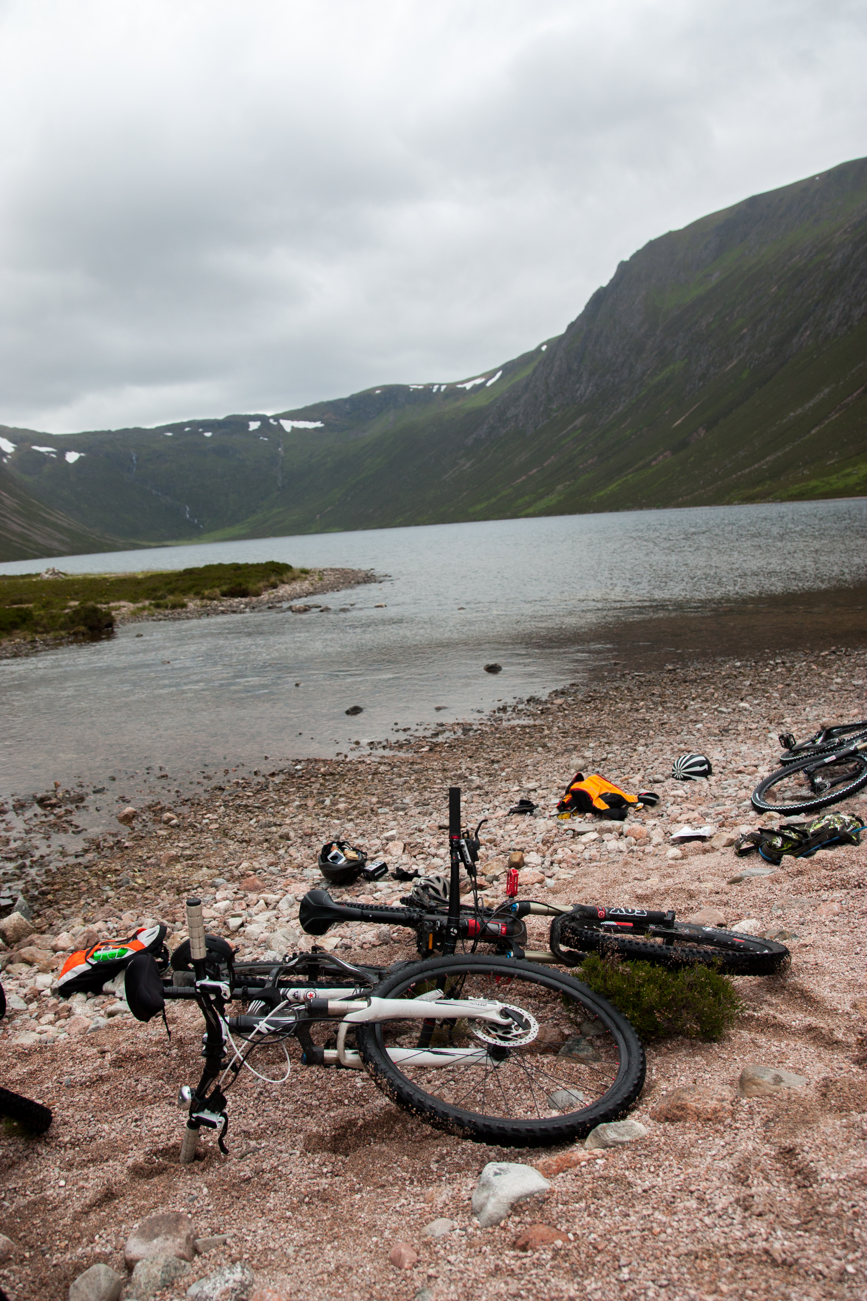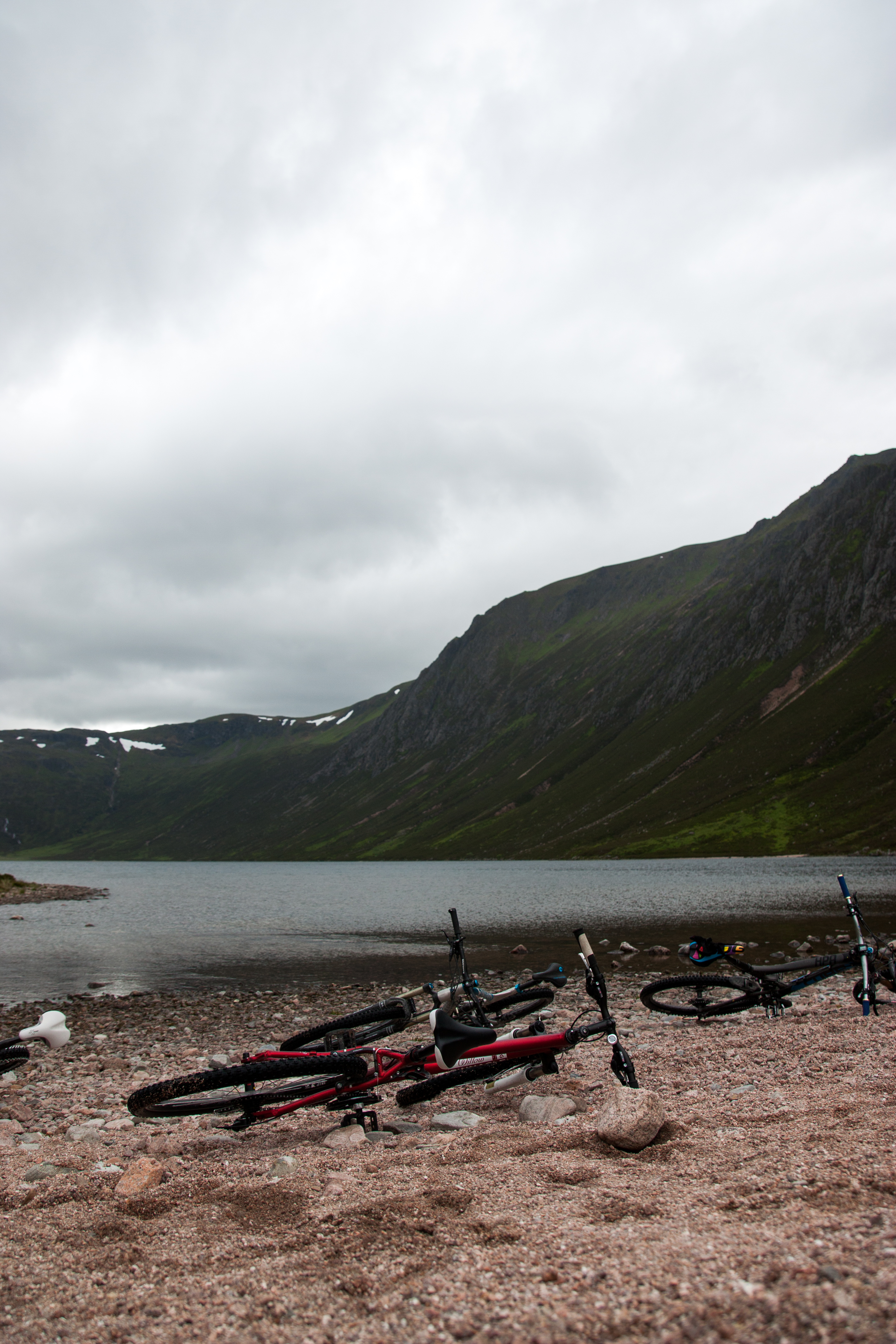 Wyjechaliśmy samochodami do miasteczka Aviemore. Stamtąd udaliśmy się na południe w stronę jeziora Loch Einich, które było naszym punktem docelowym. Trasa o długości około 30 km (razem w obydwie strony) i umiarkowanym stopniu trudności. Napewno nie w typie osób, które lubią przejażdżki kabrioletem, a potem wyciągają koszyczek z jedzeniem i piknikują na zielonej trawce 😉 Kiedy dojechaliśmy do jeziora, skryliśmy się przed wiatrem i zaczynającym padać deszczem i szybko pochłanialiśmy nasze owsiane i inne energetyczne batoniki. A potem trzeba było szybko pedałować spowrotem do Aviemore, żeby sie rozgrzać… 🙂 Trasa powrotna była już z górki…