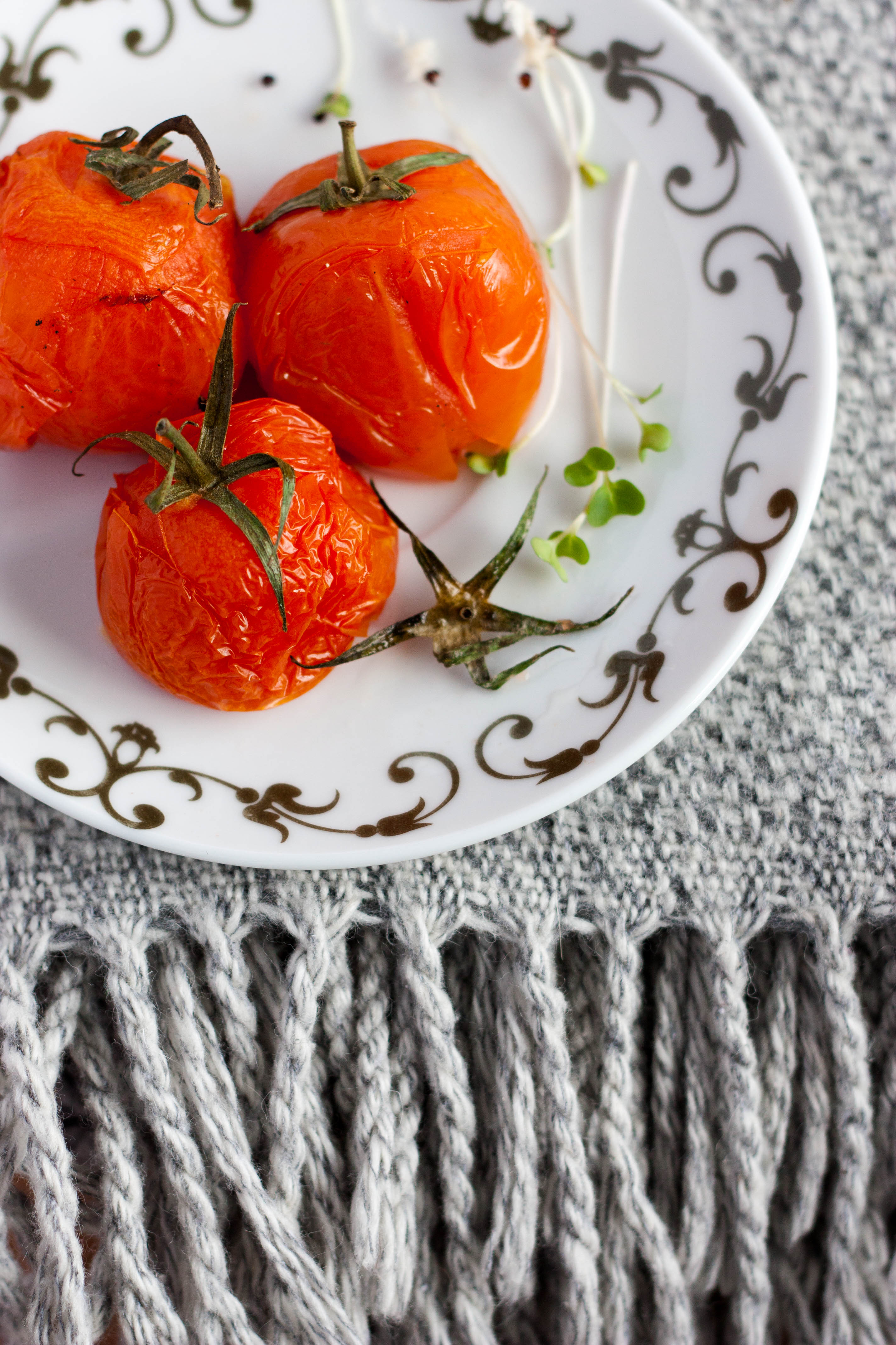 Pomidory piec w żaroodporym naczyniu, w piekarniku nagrzanym do 200 stopni, przez około 35 min. Dać skórce lekko sie podpiec. Cebulę obrać i podpiec bezpośrednio na gazie do zwęglenia pierwszej warstwy. Pietruszkę obrać i pokroić na małe kawałki.