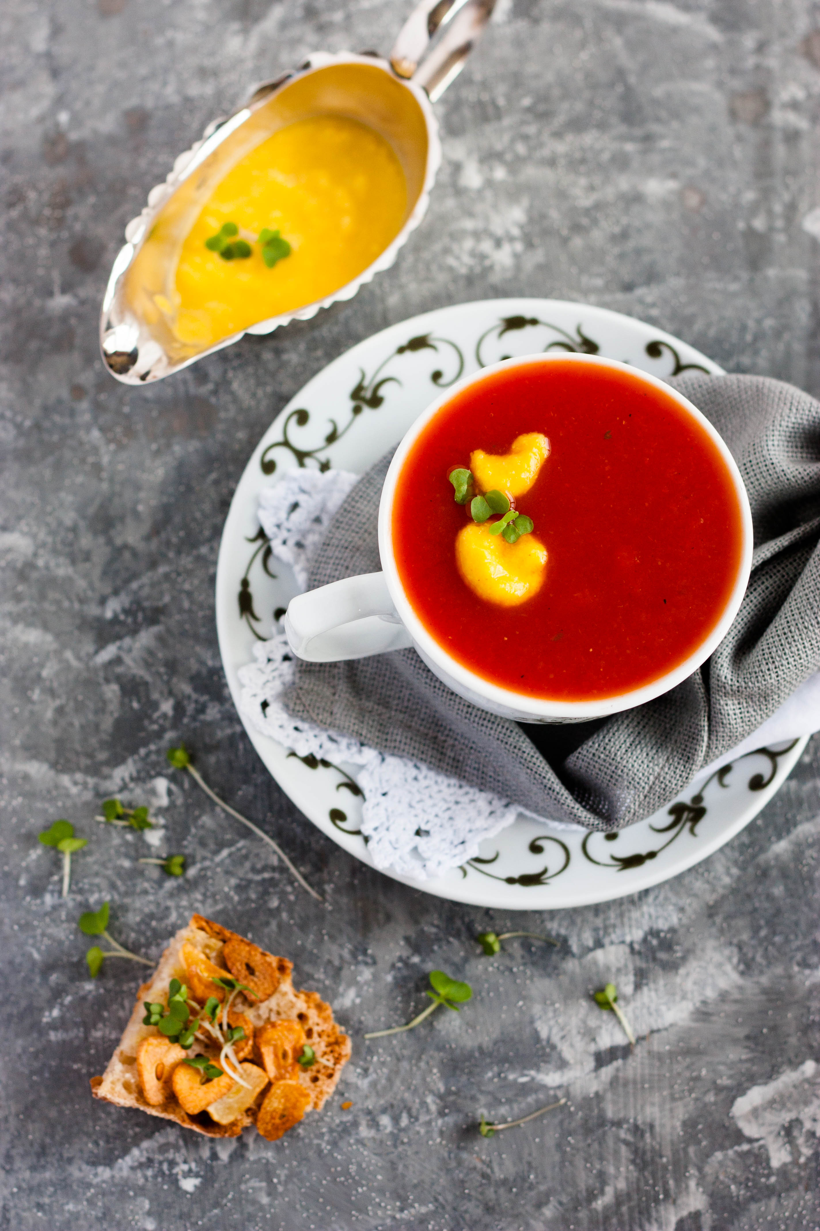 Pomidory wyciągnąć z piekarnika, przełożyć do garnka, zalać szklanką wody, dodać cebulę i pietruszkę, kilka ziarenek soli morskiej, świeżo mielony pieprz, doprowadzić do wrzenia i gotować około 10 min. Cebulę i pietruszkę wyrzucić. Zupę zmiksować i przetrzeć przez drobne sito.