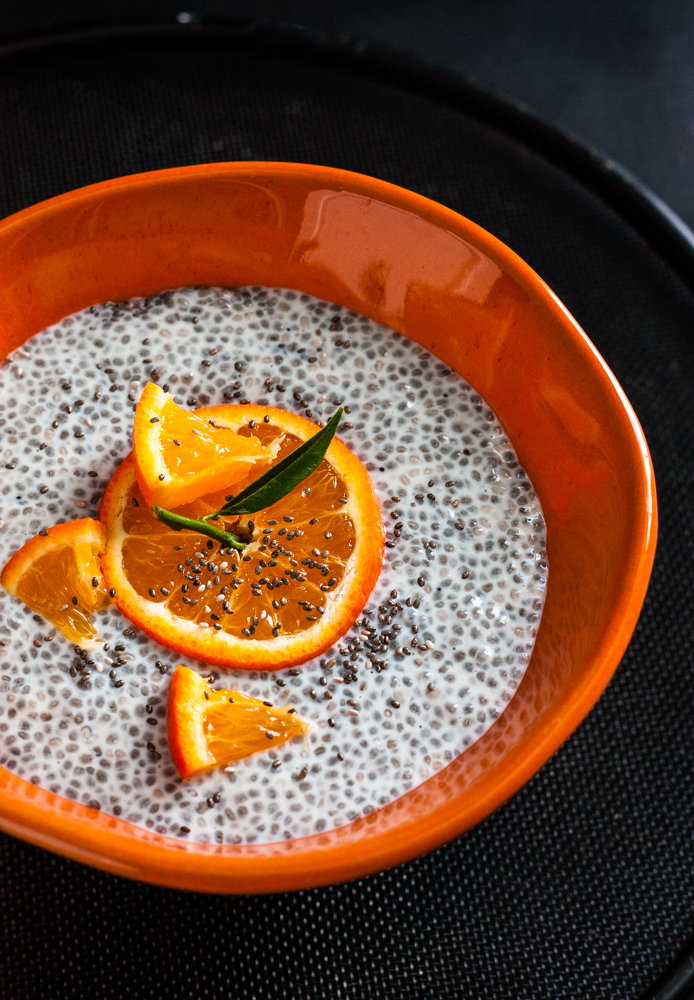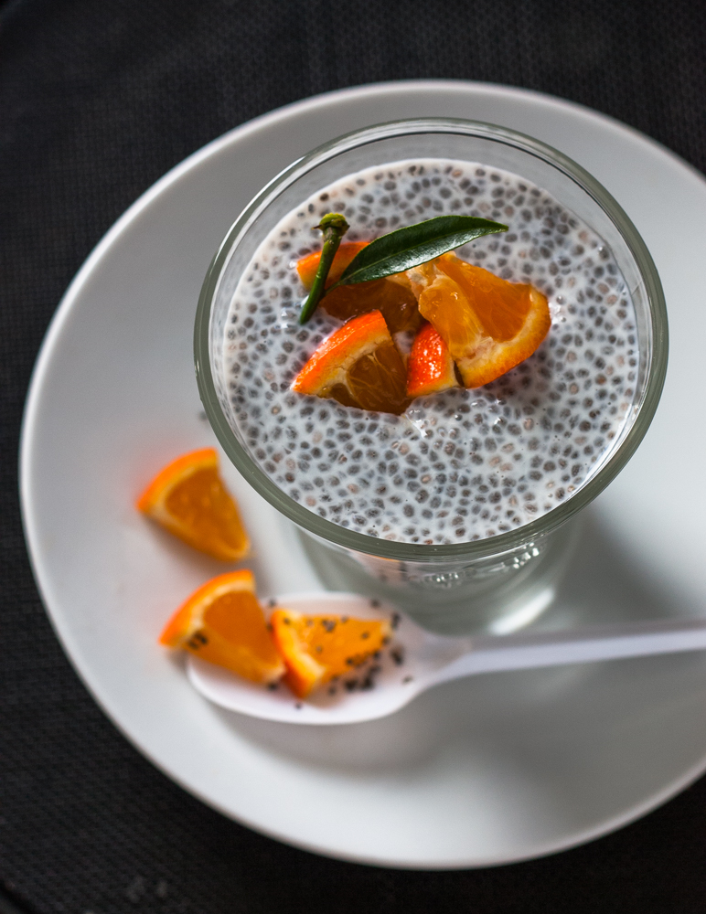 Mleko nalać do dużego kubka, wsypać nasiona, dokładnie wymieszać i odstawić minimum na 4 godziny(lub na cała noc). Po tym czasie nasiona napęcznieją i pudding zrobi się gęsty. Dodać sok wyciśnięty z pomarańczy lub pokrojoną obrana mandarynkę. Dodać syrop lub cukier do smaku. Ja swój lekko podgrzewam i dodaję dużo owoców. Lub domowy dżem. Pudding będzie bardziej gęsty jeśli dodamy więcej nasion np 3 łyżki (polecam wymieszać dokładnie kilka razy, gdy dodajemy więcej nasion)