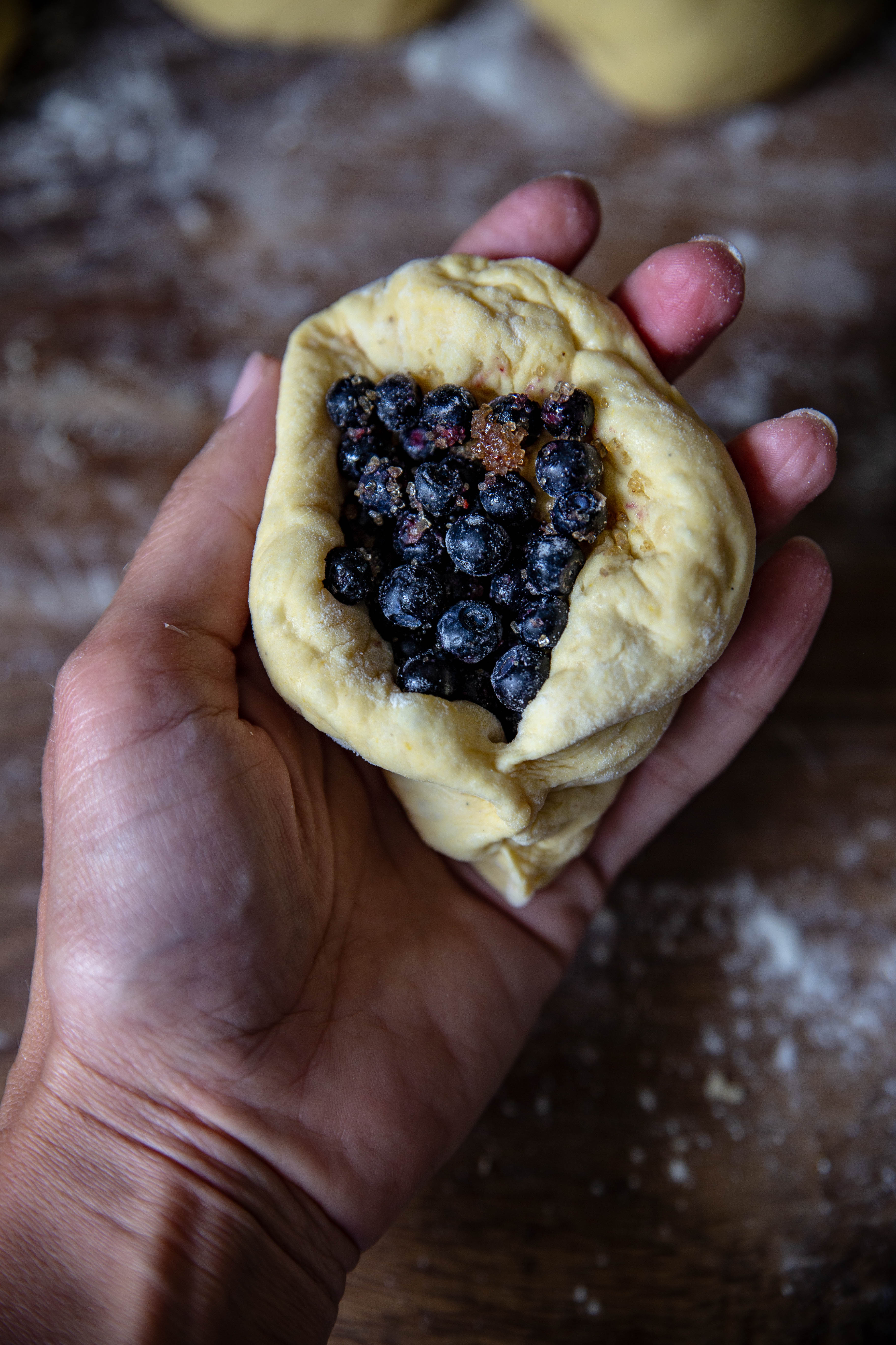 Wyjąć ciasto z lodówki i odczekać godzinę. Ciasto podzielić na kawałki o wadze około 83 g. Formować placuszek i na środek nakładać ok 2-3 łyżeczki jagód. Ciasto sklejać jak pieroga i układać na blaszce sklejeniem do dołu.
