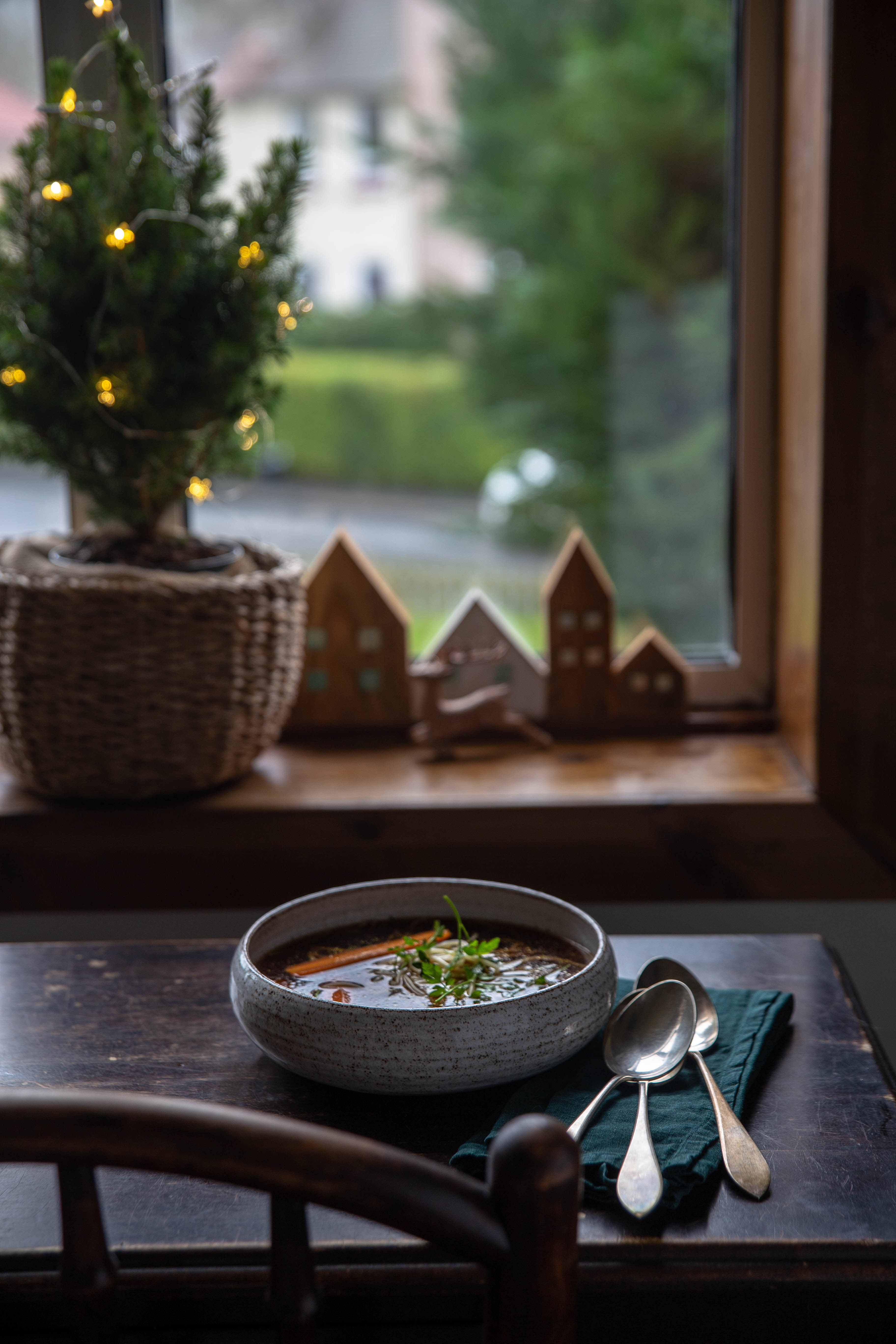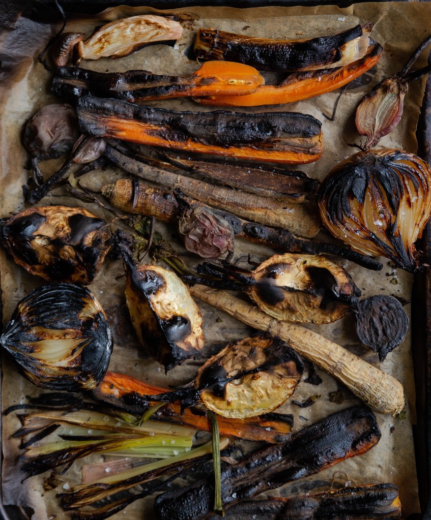 Rosołek powstaje na mocno przypieczonych warzywach, przypiekam je na lekki węgielek pod grillem. Potem do garnka idą kolejno pełne umami pomidory, grzyby, świeży czosnek i pietruszka, jabłko, palona cebula, ziele angielskie, liść laurowy, na końcu kawałek kombu. Zwykle przysmażam warzywa na rosołki lub zupy ale od kiedy obejrzałam webinar „Roślinniejemy” z Marią Przybyszewską, nie robię bulionu inaczej jak z tego przepisu. Lockdown był czasem czytania książek i uczenia się nowych rzeczy, nie narzekałam 🙂