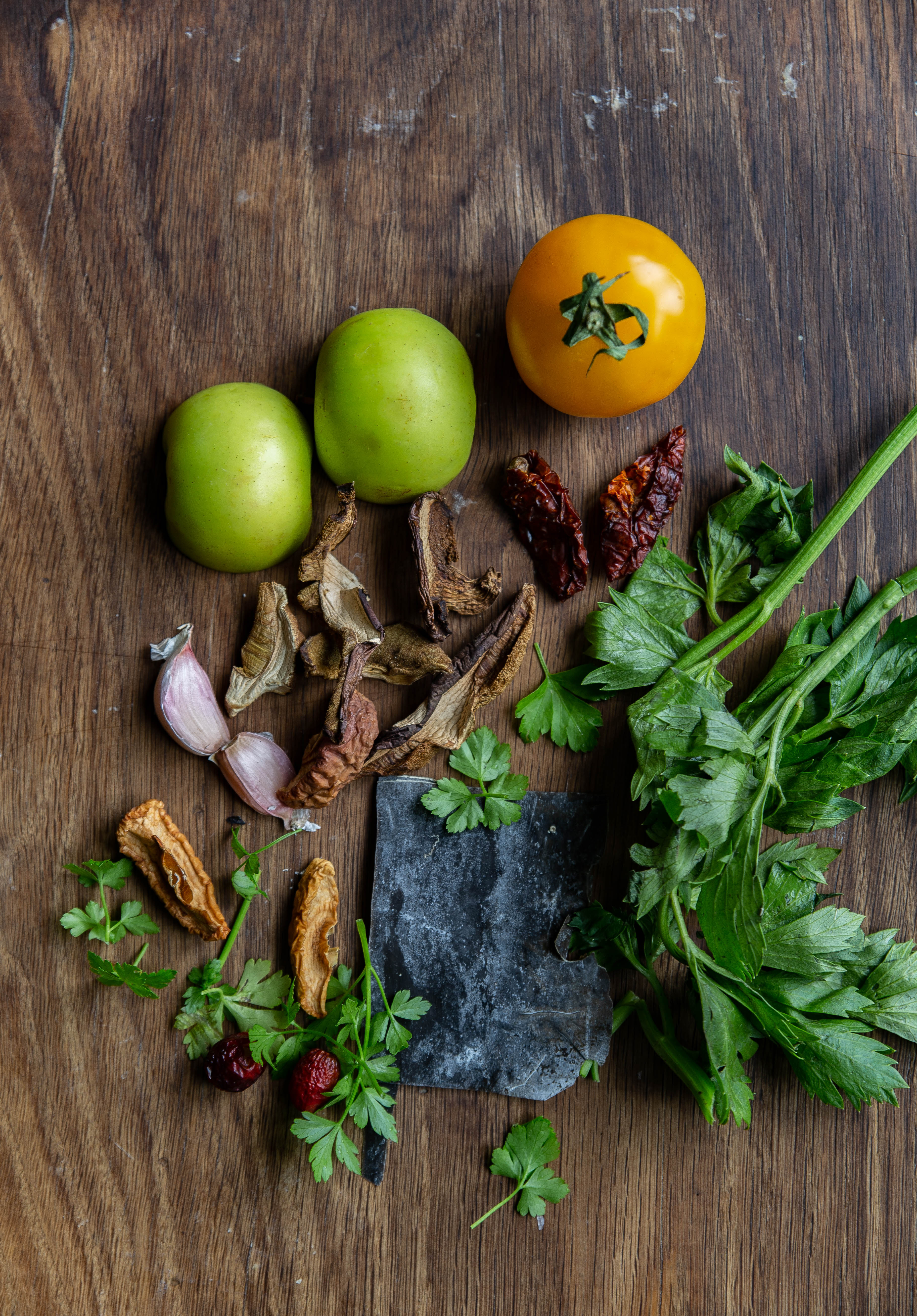 - garść suszonych grzybków, 1 kwaśne jabłko, 2 małe pomidory, 2 ząbki czosnku